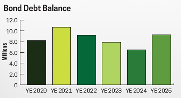 In 2025, the District did incur new debt. Thanks to an unprecedented storm that left 100% of the district without power and more than 850 downed poles, the District did add a bond for $4.080 million. This will help us spread some of that cost out over 20 years. There are currently 4 outstanding bond issues, leaving total bond debt at $9.28 million.